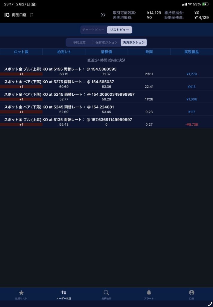 停滞しています ゴールドで遊ぶ 2026.02.28 今週はデイトレでトレードしていましたが、勝ったり負けたりを繰り返して停滞しています。 まぁ相場もあまり動かなかったのでデイトレでは入りづらかったのもあります。 来週はデイスキャおり混ぜてコツコツ行こうと思います。 Screenshot