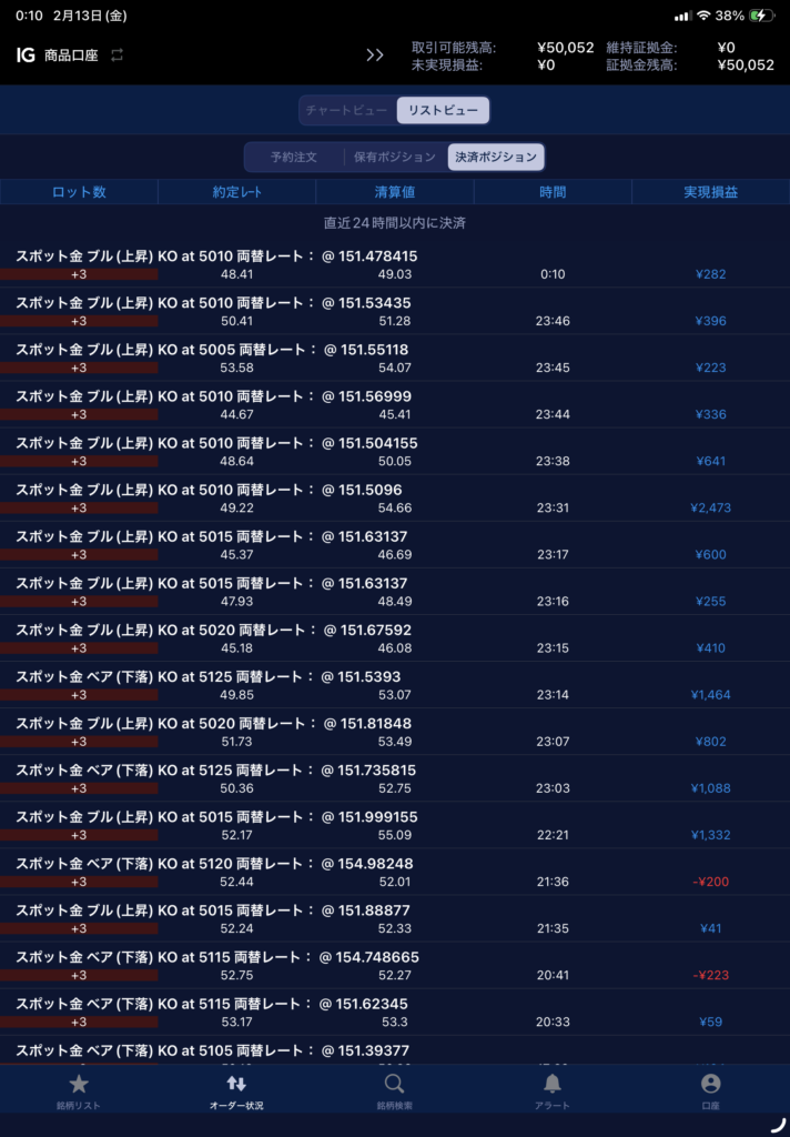 横這い相場 雑記 2026.02.13 昨日は動きは鈍く横這いが続いていました。 横這い相場は見送った方が良いと言われますが、私は気にせずやります。 ある意味動きが読みやすいと思っています。 ただし、動き出したら大きく動くのでドカンに気をつけて。